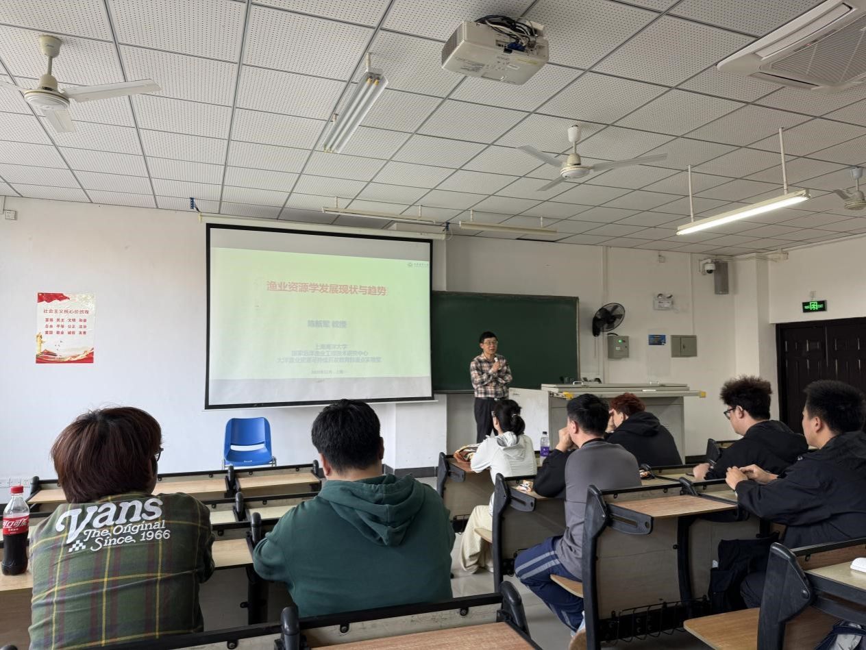 授课期间,陈新军教授以《渔业资源学发展现状和趋势》《工业4.0和远洋渔业科技》《中国鱿鱼AI渔情预报研究进展》为三大主题,层层递进、深入浅出地展开讲解。在渔业资源学板块,他精准剖析了当前该领域在海洋生物学、栖息地保护及资源评估等核心方向的研究现状,明确指出,现有研究已牢牢把握核心矛盾,未来的突破关键在于对矛盾背后各类影响因素的“深化挖掘”与“细化分析”,为在场研究生指明了后续科研的发力方向。