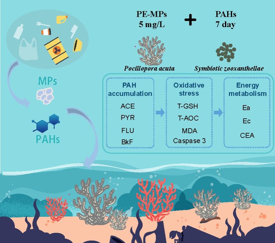 微塑料(MPs)与多环芳烃(PAHs)是珊瑚礁生态系统中普遍存在的持久性有机污染物。微塑料可能通过"特洛伊木马效应"加剧多环芳烃的生物累积与毒性,但其对珊瑚共生体的综合影响仍知之甚少。本研究以造礁石珊瑚鹿角杯型珊瑚(Pocillopora acuta)为研究对象,在西岛海域原位投放聚乙烯微塑料(PE-MPs)以评估其PAHs富集能力,随后将珊瑚暴露于形成的污染复合体中,探究其对珊瑚-共生藻共生关系产生的毒理学效应。本研究表明,三亚西岛码头附近海水中PAHs总浓度为50.65 ng/L,以低分子量PAHs为主。在珊瑚礁环境中,PE-MPs对PAHs具有强富集能力,尤其针对蒽(ACE)、菲(PHE)和芘(PYR)等化合物。将珊瑚暴露于携带PAHs的PE-MPs后,PE-MPs促进了PAHs在珊瑚共生系统内的生物累积,其中共生藻类(Symbiodiniaceae)中的浓度最高。所累积的PAHs通过摄食和直接接触途径对珊瑚宿主产生毒理学效应,包括诱发氧化应激、脂质过氧化及细胞凋亡反应。同时,PAHs扰乱了共生藻的能量代谢与光合作用,从而削弱了珊瑚生理机能及生态韧性。这些发现证明PE-MPs增强了PAHs的生物可利用性与毒性,最终破坏珊瑚-共生藻共生关系,对珊瑚礁生态系统构成生态风险。本研究阐明了微塑料-多环芳烃共暴露条件下的生物累积模式、传输途径及分子毒理学机制。这些发现为评估微塑料与多环芳烃在珊瑚礁生态系统中叠加的生态风险提供了科学依据,并为未来污染防治与珊瑚礁保护策略的制定提供了理论指导。